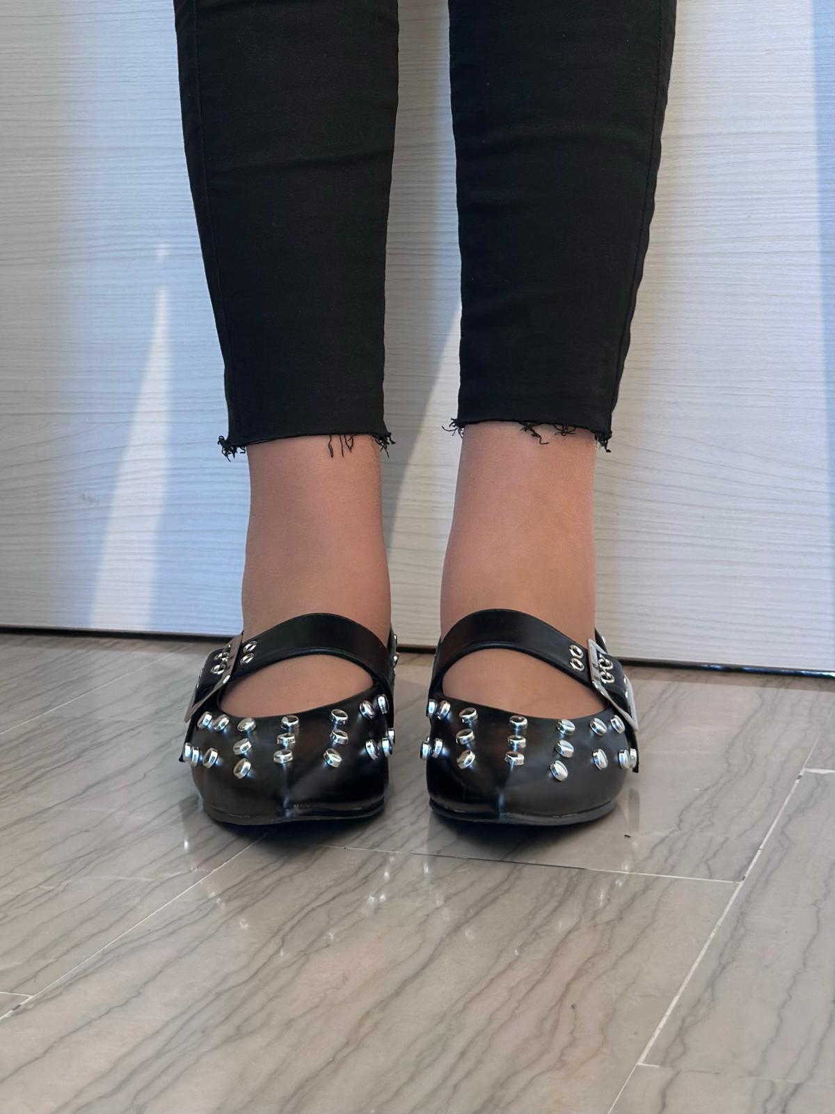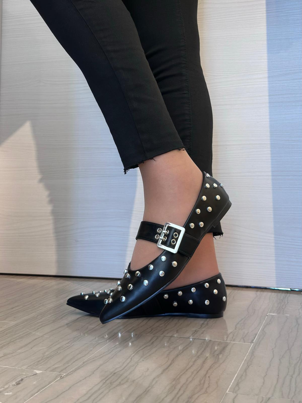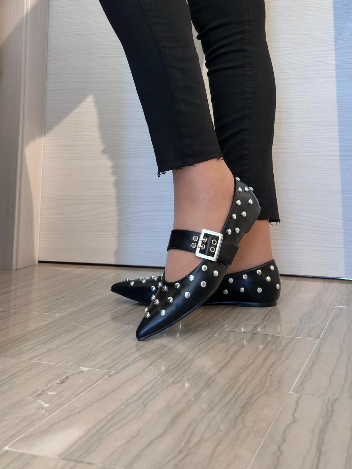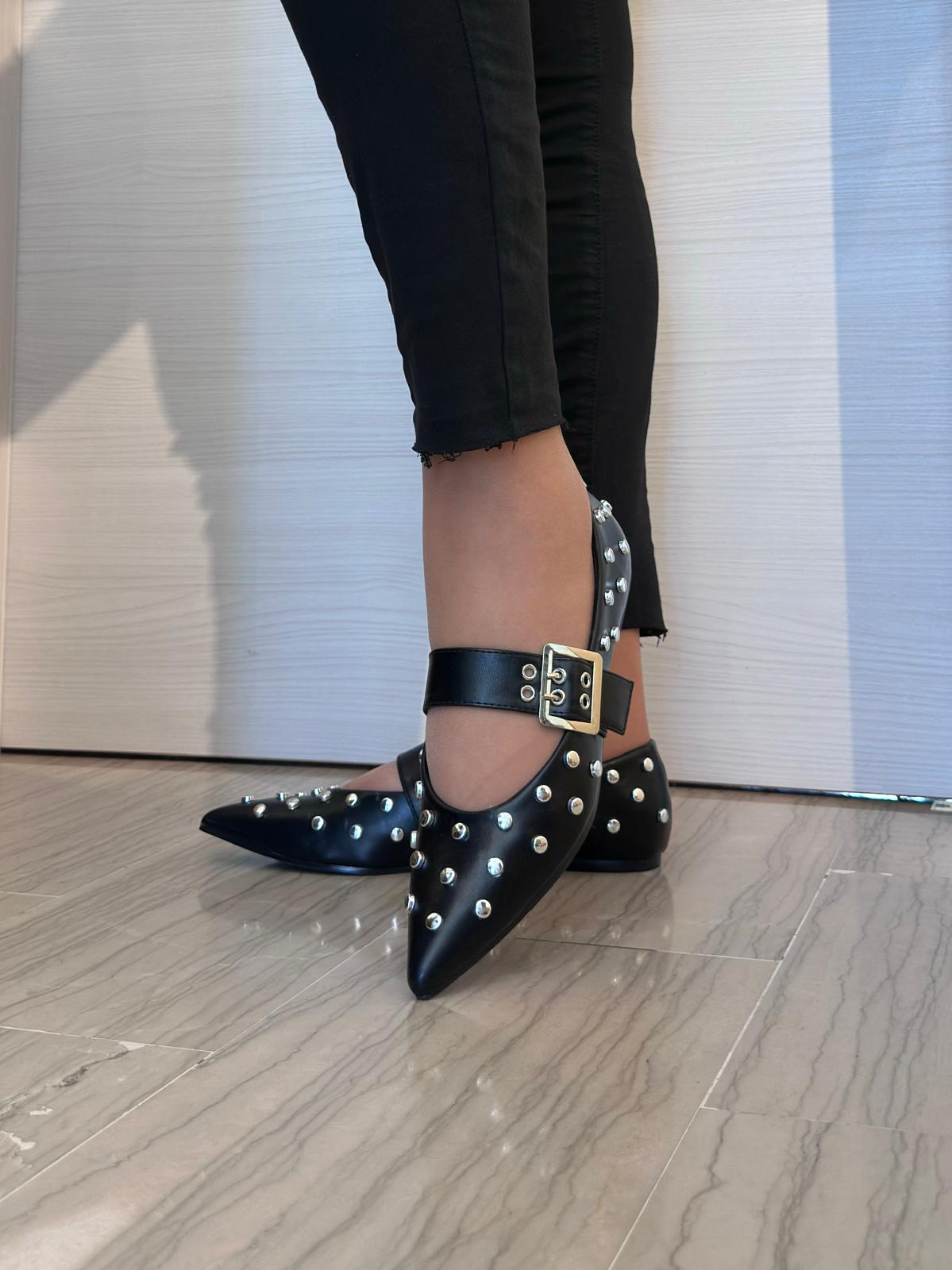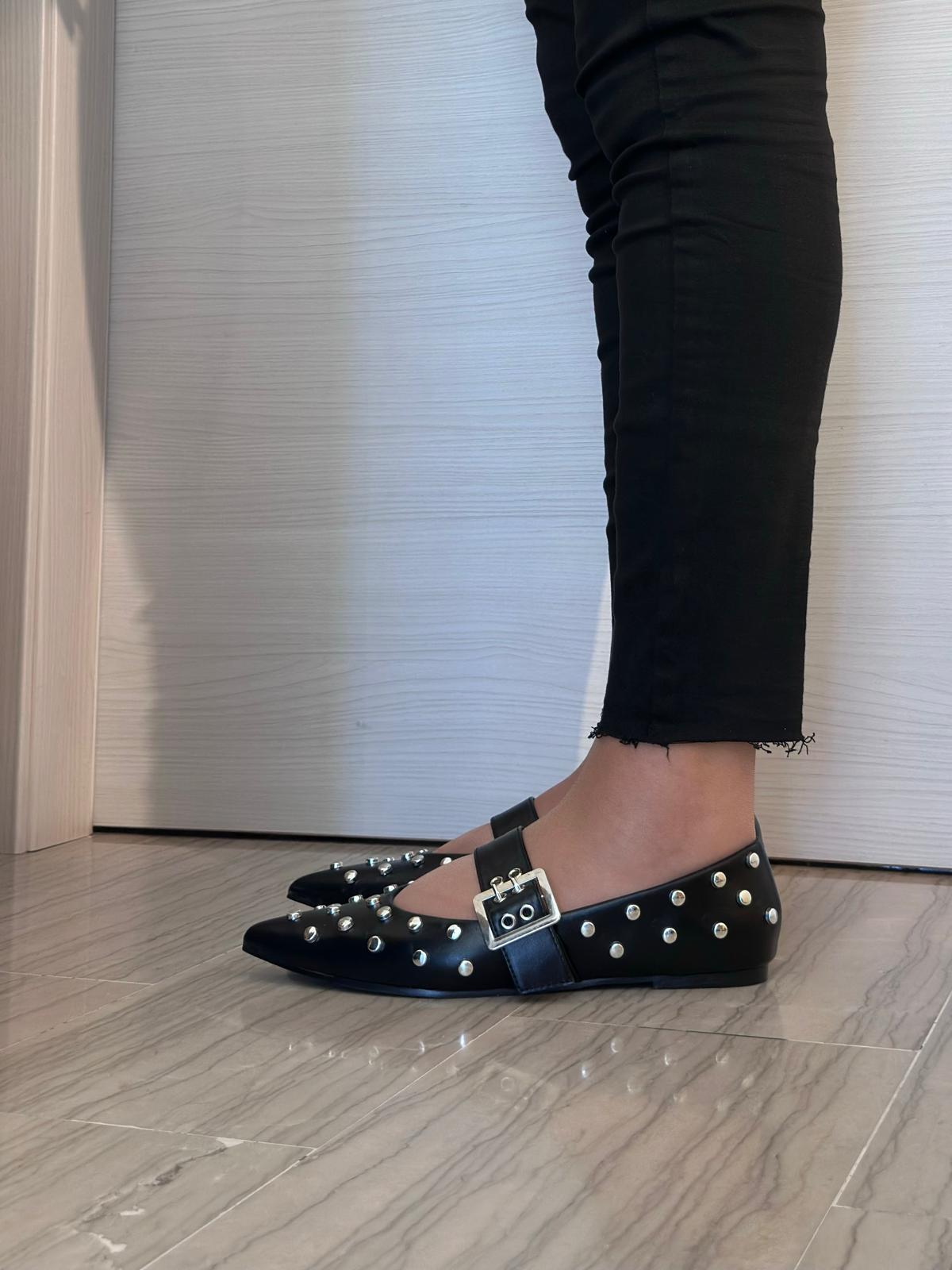 Un mix perfetto di comodità e stile. Questa ballerina nera a punta, impreziosita da borchie metalliche e cinturino con fibbia, è pensata per chi vuole un look deciso ma pratico.