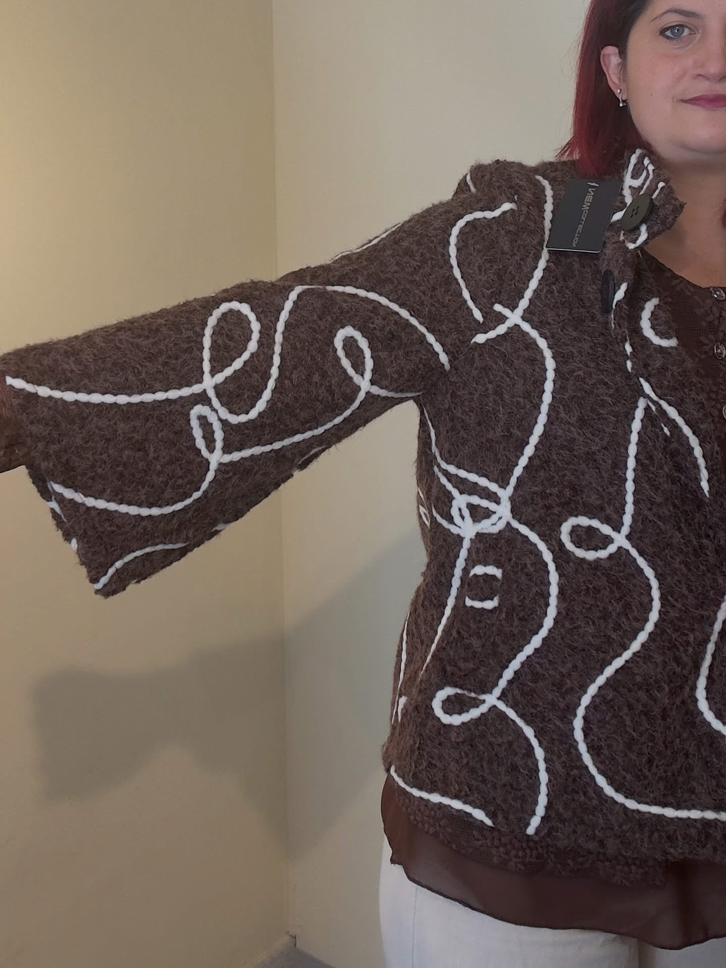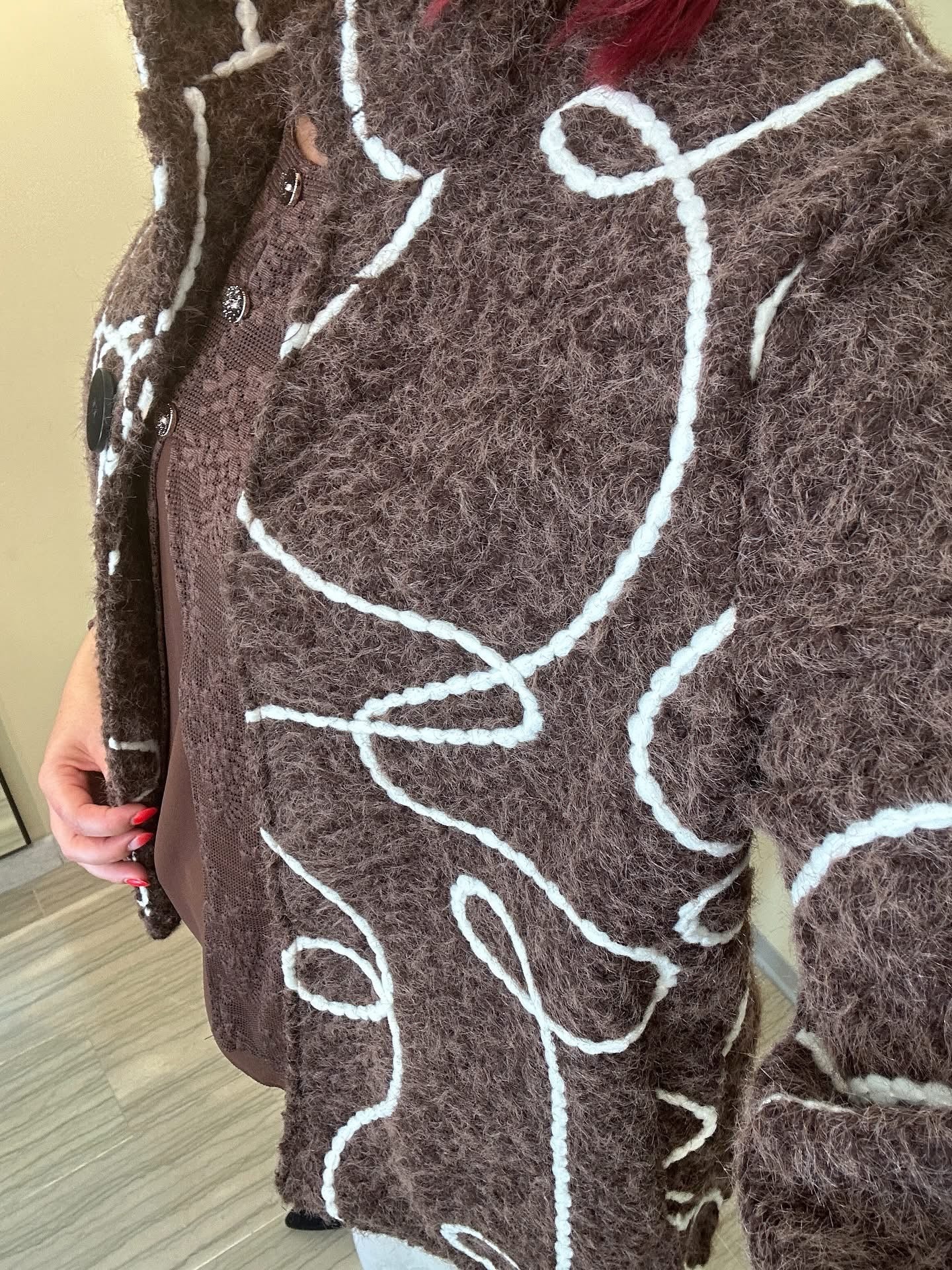Cappottino a trapezio marrone con ricamo a cordonetto e manica a campana. Perfetto da utilizzare sia come cappottino che come blazer. Si presta bene per dare un tocco di fantasia ai tuoi outfit casual tinta unita ma perfetto da abbonare ad un outfit da sera. Taglia unica vestibilità fino a una XL