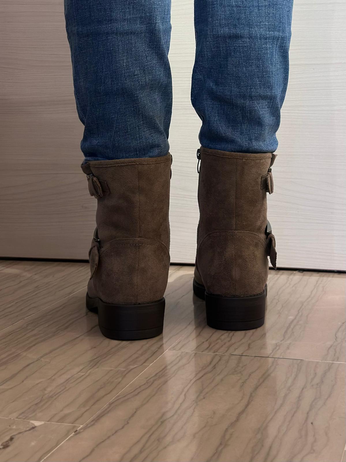 Lo stivaletto in ecocamoscio color taupe aggiunge un tocco elegante a qualsiasi outfit. La fibbia laterale e la suola comoda lo rendono ideale per chi ama coniugare praticità e stile.