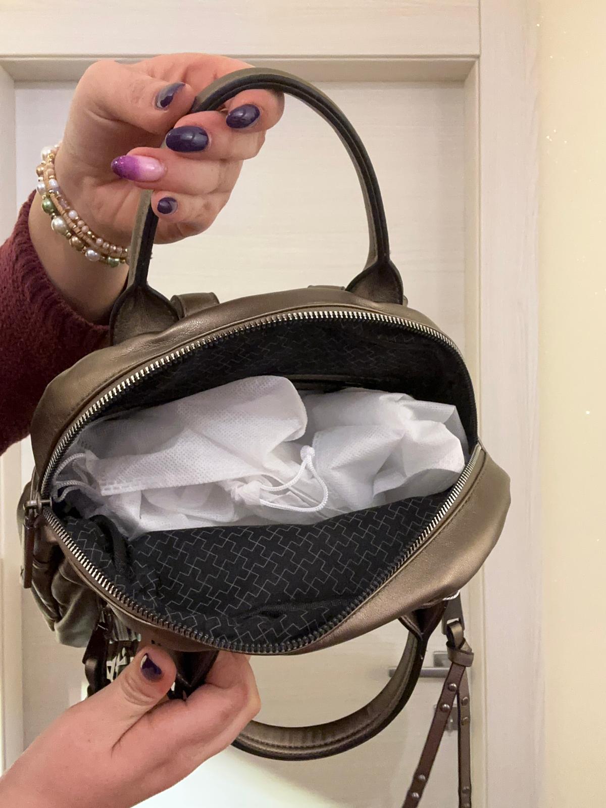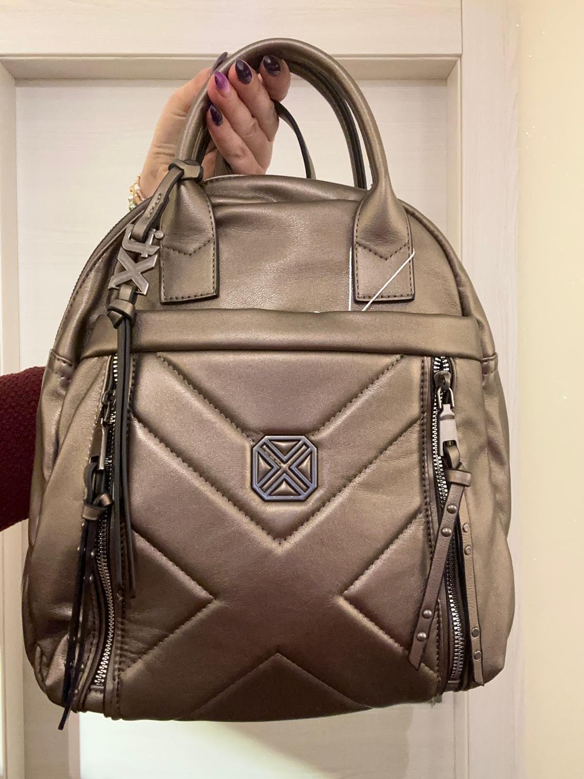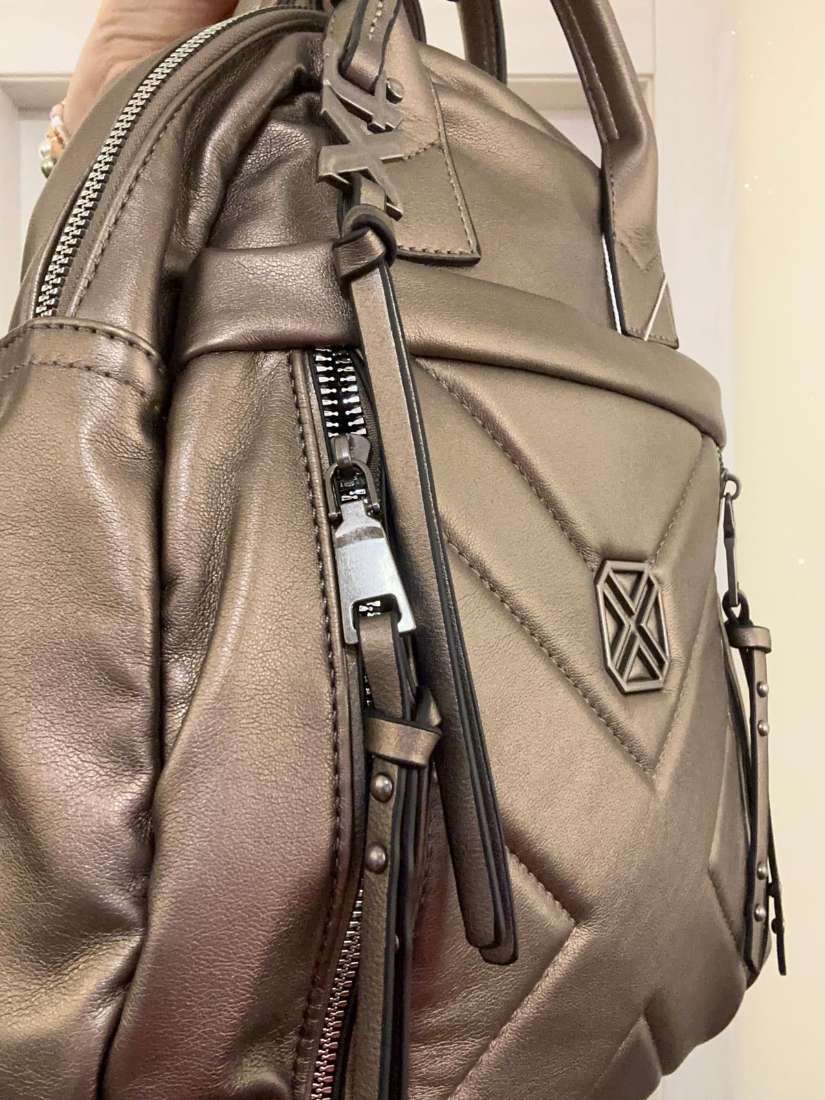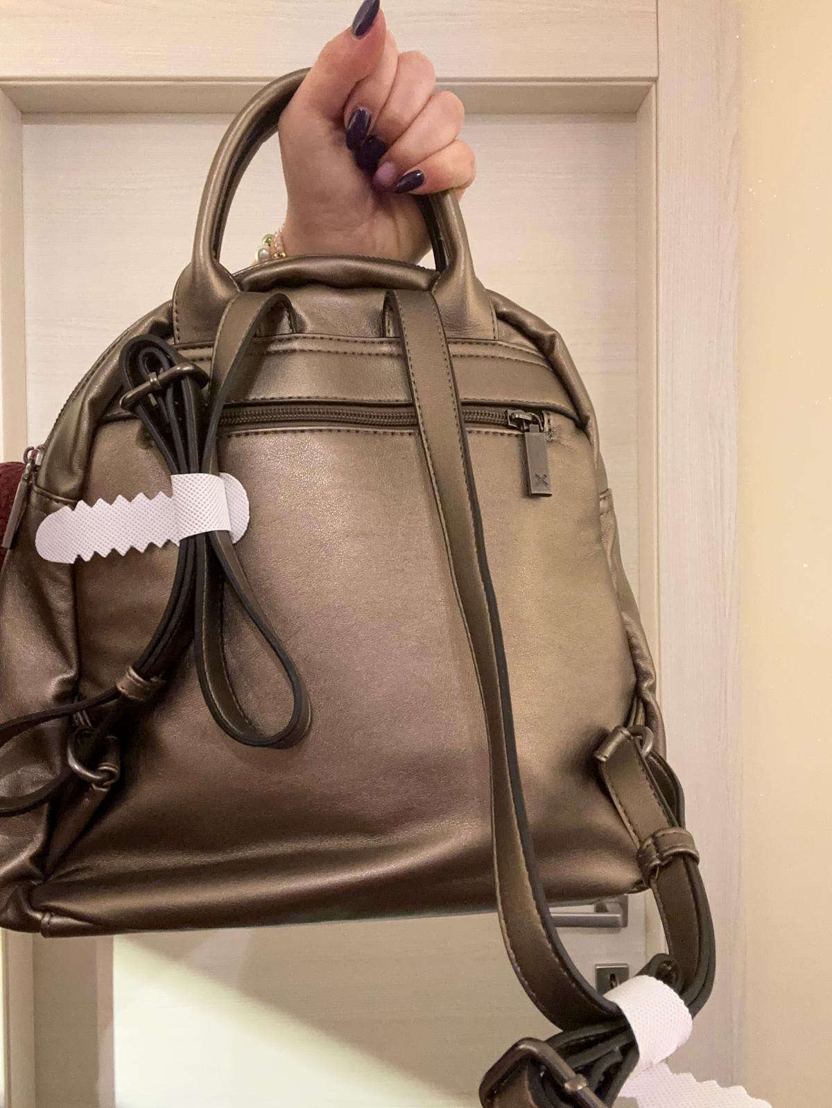 Zaino da donna con finitura bronzo satinato, trapuntato, dotato di più tasche.