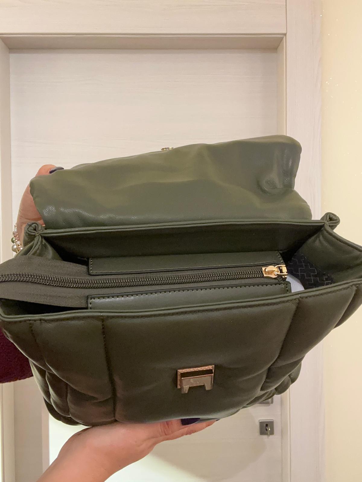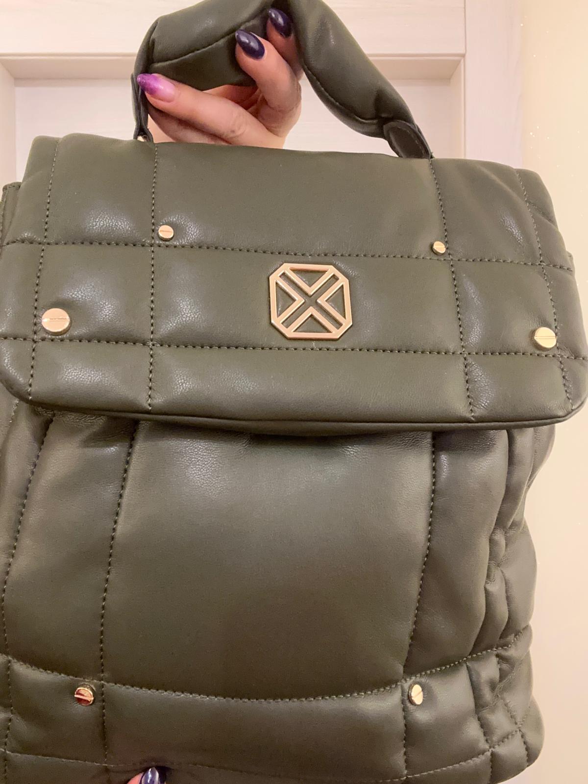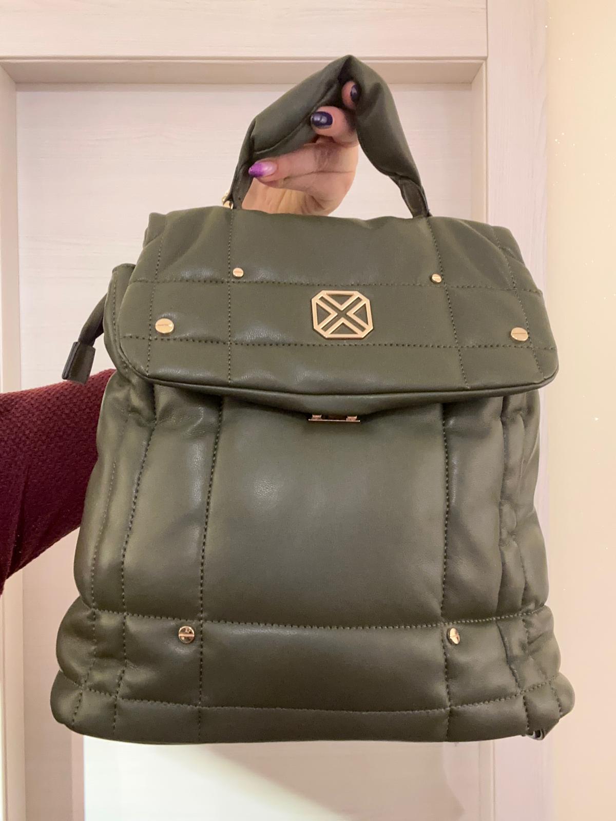 Zaino donna XTI in stile urban chic, realizzato in materiale soft touch effetto imbottito, colore verde oliva, con pattina frontale e chiusura con bottone a incastro. Spallacci regolabili e manico superiore per doppia portabilità.